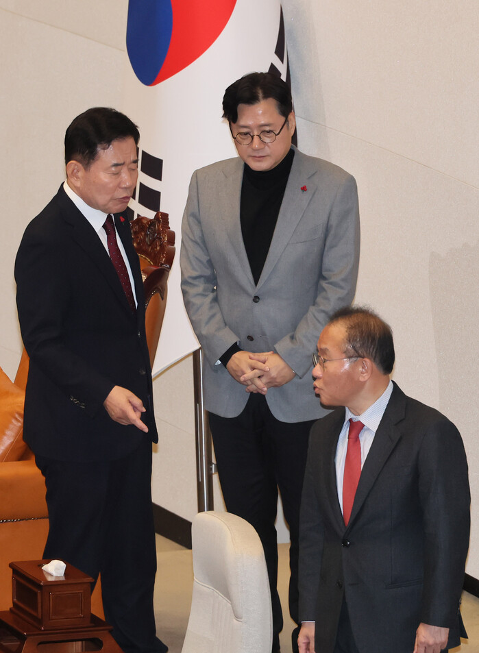 | ▲ 김진표 국회의장과 홍익표, 윤재옥 원내대표(사진=연합뉴스) |