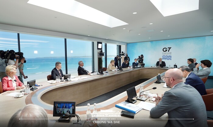 문 대통령은 이날 G7 정상회의의 마지막 공식일정인 '기후변화·환경' 세션에 참석해 선도 발언을 요청받은 뒤 이와 같은 설명을 했다. G7 정상회의에서 문 대통령에게 선도 발언을 요청한 것은 그동안 우리나라의 탄소 중립을 향한 강한 의지 표명과 과감한 기후정책 변화 시행에 대한 국제사회의 높은 평가가 반영된 것이다.