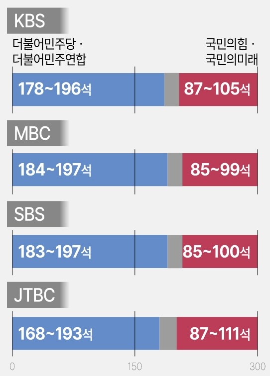 방송3사(KBS, MBC, SBS)와 JTBC 출구조사 결과 4·10 총선에서 더불어민주당과 민주당 주도 비례대표 위성정당 더불어민주연합 등 범야권이 압승할 것으로 예측됐다.