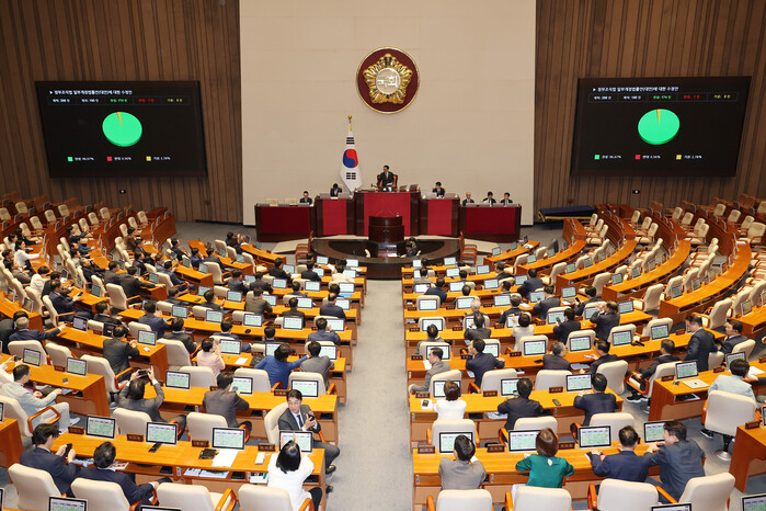 이날 국회 본회의에서는 재석 의원 180명 중 찬성 174명, 반대 1명, 기권 5명으로 개정안이 의결됐다. 국민의힘은 ‘졸속 처리’라며 필리버스터(무제한 토론)를 이어갔으나 더불어민주당 등 범여권이 종결동의안을 가결시켜 표결에 부쳤다.