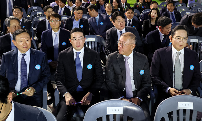 | ▲ 15일 서울 세종대로 광화문광장에서 열린 제21대 대통령 국민임명식 '광복 80년, 국민주권으로 미래를 세우다' 행사에 기업인들이 참석해 있다. 오른쪽부터 이재용 삼성전자 회장, 정의선 현대차그룹 회장, 구광모 LG그룹 회장, 신동빈 롯데그룹 회장. 2025.8.15 (사진=연합뉴스) |