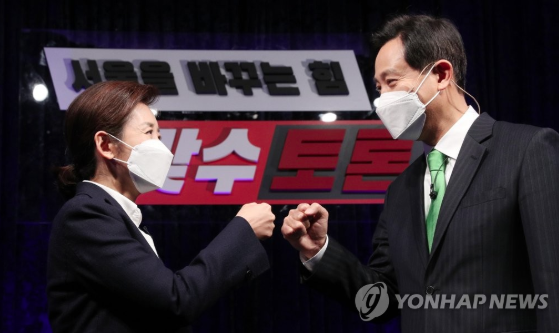 | ▲ 2021년 2월 23일 국민의힘 서울시장 경선후보 나경원과 오세훈 (사진=연합뉴스) |