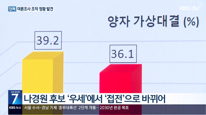▲ 2021년 2월 23일 국힘 서울시장 당내 경선 당시 미래한국연구소 비공표 여론조사 결과.위가 원본, 아래가 조작 후 (출처=KBS뉴스) |