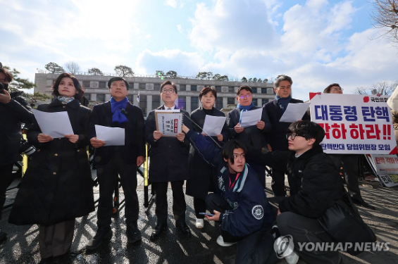 헌재 정문 앞에서 연 기자회견에는 민주당 박범계, 서영교, 박희승, 김기표, 이성윤 의원과 조국혁신당 박은정 의원이 참석했다.