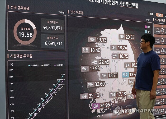 제21대 대통령선거 사전투표 첫날인 29일 전국 투표율 19.58%(오후 6시 기준)를 기록했다. 사전투표가 적용된 역대 전국단위 선거에서 첫날 기준 최고 투표율이다.