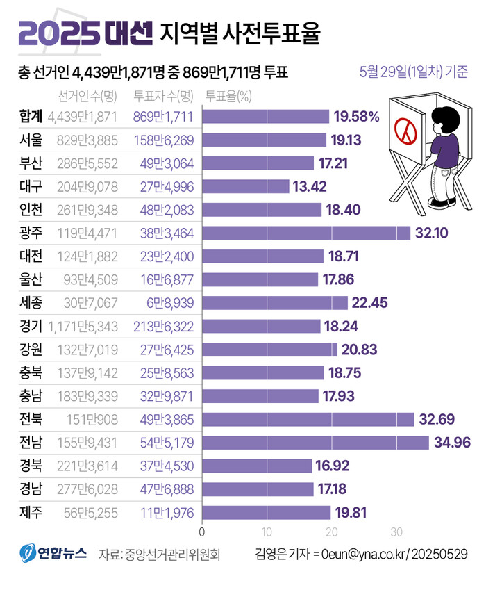 호남권 투표율 가장 높아...전남 34.96%, 전북 32.69%, 광주 32.1% 순