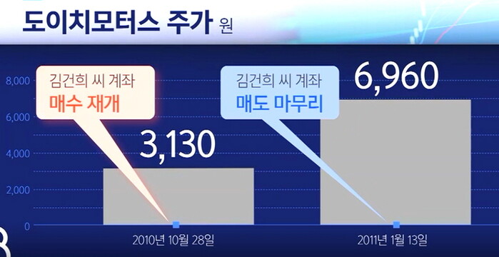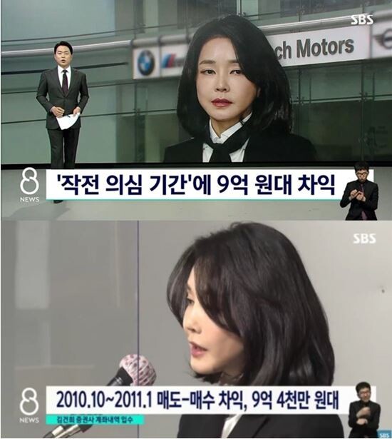 이렇게 두 달 넘게 28차례에 걸쳐 매매가 이뤄진 가운데 총 매도 금액과 매수 금액의 차액은 9억4천200만원 플러스였고, 해당 기간은 검찰이 발표한 도이치모터스 주가 조작 일당의 이른바 '작전 기간' 가운데 2단계, 인위적 매집을 통한 주가 부양 시기와 일부 겹친다고 SBS는 보도했다.