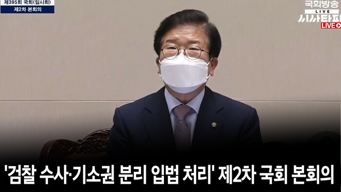 박병석 국회의장이 27일 검찰 수사·기소권 분리 입법 처리를 위한 국회 본회의를 열겠다고 밝히면서 여야 중재안 합의를 번복한 국민의힘을 비판했다. 박 의장은 “국민의힘이 중재안 합의를 백지화하고 재논의조차 거부했다”며 “여야 원내대표가 합의해 의원총회 추인까지 거쳐 국민께 공개적으로 드린 약속은 지켜져야 한다”고 밝혔다.