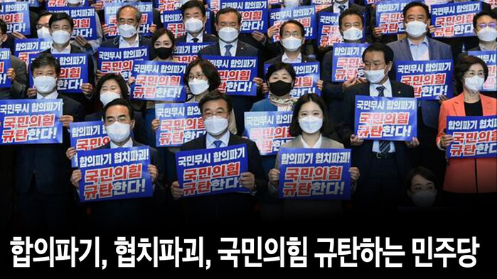 앞서 26일, 더불어민주당은 윤호중,박지현 공동비대위원장과 의원들이 국회 로텐더홀 계단에서 검찰개혁 합의파기 윤석열 국민의힘 규탄대회를 열었다.