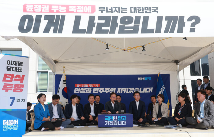 주 3회 열리는 민주당 최고위원회의는 이재명 대표의 단식으로 현재는 국회 단식투쟁 텐트에서 진행되는데 6일 최고위에서도 윤석열 정부를 향한 비판의 시위가 드높았다.