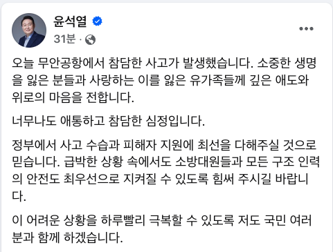 직무정지 중인 윤석열이 29일 오후 전북 무안공항 제주항공 참사를 애도하는 글을 페이스북에 올렸다. 윤 씨가 페이스북에 메시지를 올린 것은 지난 달 13일 대입수학능력시험 전날에 글을 쓴 이후 46일만이다.