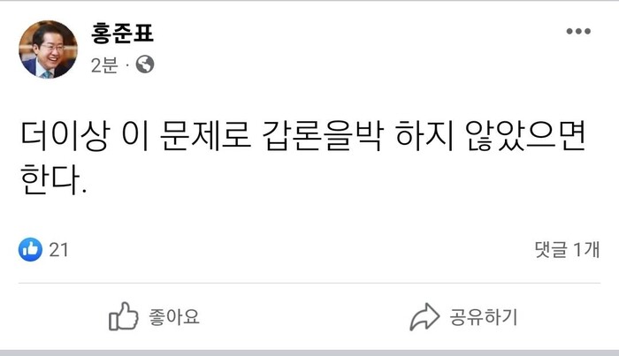 홍 시장은 이날 윤리위 결정이 내려지자 마자 곧바로 자신의 페이스북에 "더 이상 이 문제로 갑론을박 하지 않았으면 한다"는 글을 남겼다.