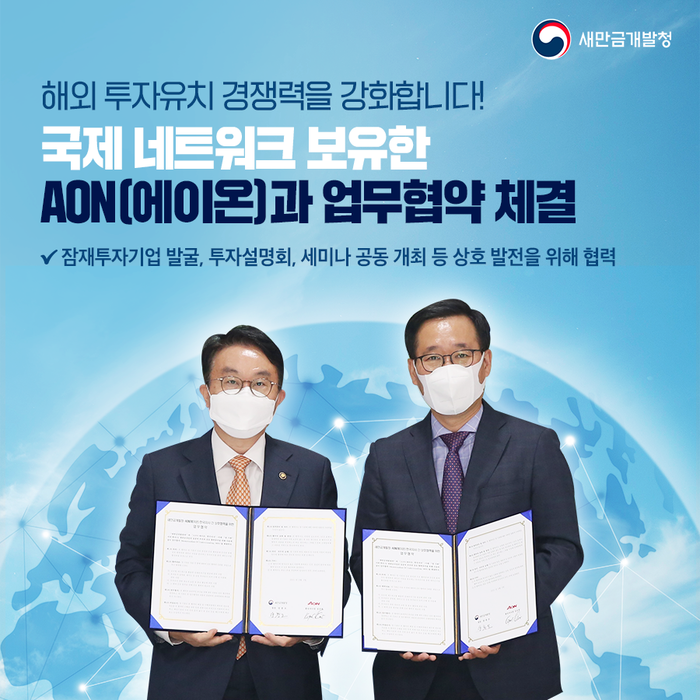 새만금개발청(청장 양충모)은 9월 3일 서울투자전시관에서 AON(에이온) 한국지사(지사장 김규정)와 새만금 사업의 성공적 추진과 해외 투자유치 활성화를 위한 업무협약을 체결했다고 밝혔다.