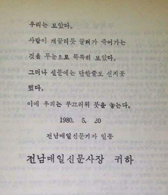 | ▲우리는 보았다. 사람이 개 끌리듯 끌려가 죽어가는 것을 두 눈으로 똑똑히 보았다. 그러나 신문에는 단 한 줄도 싣지 못했다. 이에 우리는 부끄러워 붓을 놓는다. 1980. 5. 20 –전남 매일신문 기자 일동- |