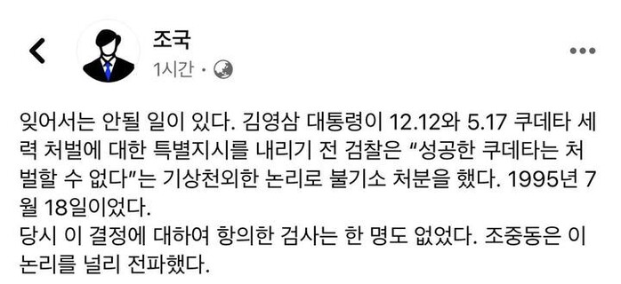 조 전 장관은 "잊어서는 안 될 일이 있다"라며 "김영삼 대통령이 12.12와 5.17 쿠데타 세력 처벌에 대한 특별지시를 내리기 전 검찰은 '성공한 쿠데타는 처벌할 수 없다'라는 기상천외한 논리로 불기소 처분을 했다. 1995년 7월 18일이었다"라고 했다.