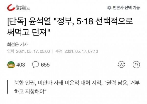 앞서 조 전 장관은 윤석열 전 총장이 5.18을 꺼집어 내 문재인 정부를 비판한 ["정부, 5·18 선택적으로 써먹고 던져"]라는 조선일보 인터뷰 기사를 페이스북에 캡처해 올렸다.