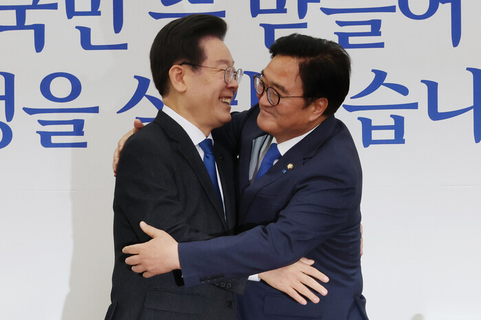 | ▲우원식 국회의장 후보와 인사 나누는 이재명 대표 (사진=연합뉴스) |