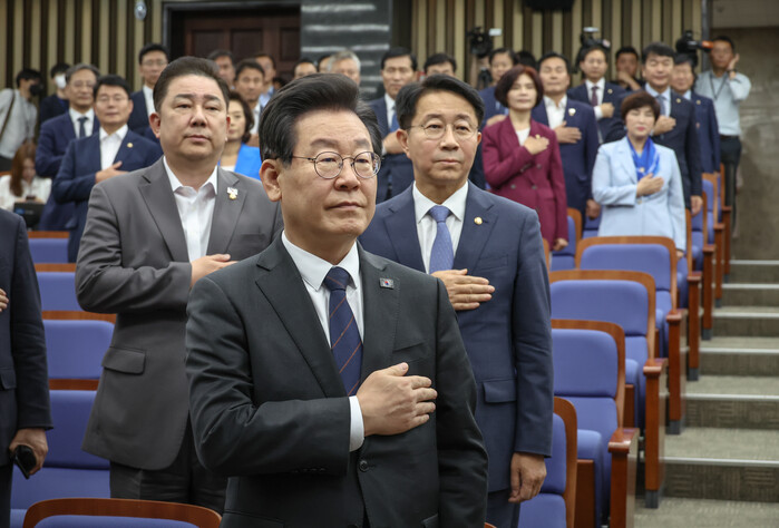 | ▲의총에 참석중인 이재명 당 대표 (사진 출챠=더불어민주당 보도자료) |