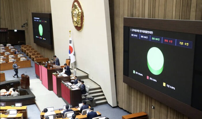 | ▲ 국회 표결 모습. 만장일치로 통과됐다는 표시가 화면에 나타나 있다 (화면 캡쳐=국회 방송) |