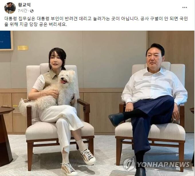 맛칼럼니스트 황교익씨는 윤석열이 당선전 한 말을 공유하며, "휴일 반려견을 안고 부인 김건희와 대통령실에 한가로이 보내는 것을 꼬집었다.