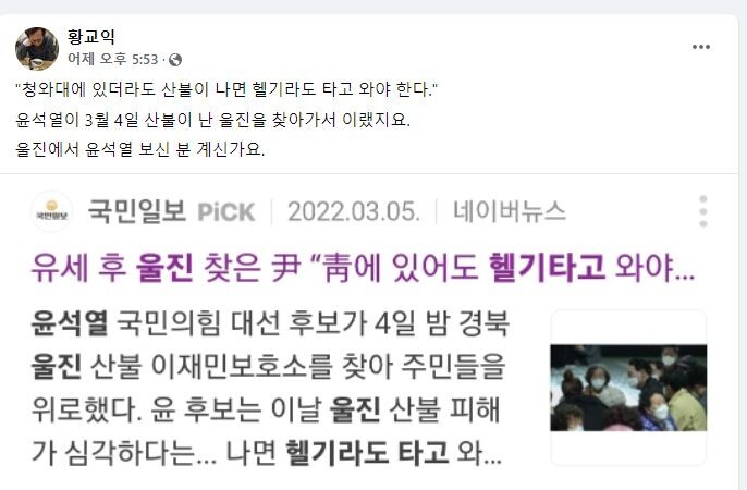 | ▲ 맛칼럼니스트 황교익씨의 페이스북 "청와대에 있더라도 산불이 나면 헬기라도 타고 와야 한다." 맛칼럼니스트 황교익씨는 윤석열이 당선전 한 말을 공유하며, "휴일 반려견을 안고 부인 김건희와 대통령실에 한가로이 보내는 것을 꼬집었다. |