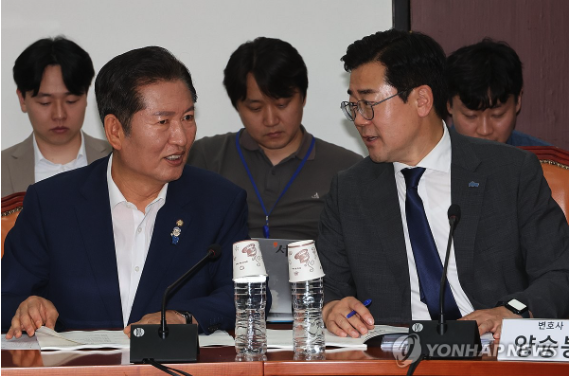 | ▲ 더불어민주당 당대표 후보인 정청래·박찬대 의원이 2일 서울 여의도 국회에서 열린 검찰개혁토론회에 나란히 참석해 대화하고 있다. 2025.7.2 (사진=연합뉴스) |