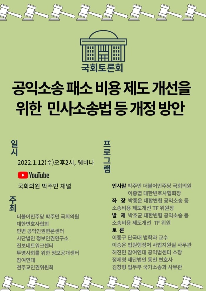 2022년 1월12일 수요일 14:00시, 웨비나, 유튜브 박주민 채널에서는 "공익소송 패소비용 제도 개선위한 민사소송법" 등 개정 방안 국회 토론회 개최를 한다.