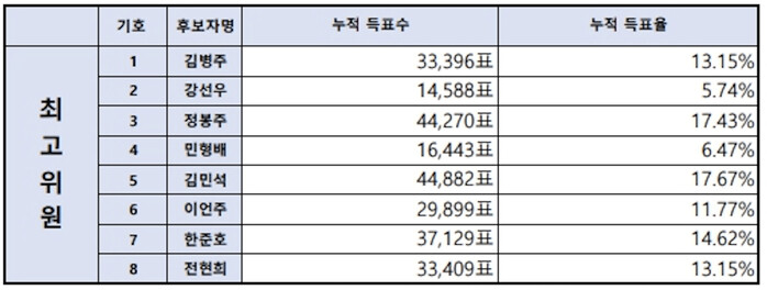 3일 익산에서 진행된 당대표 및 최고위원 선출 순회경선 권리당원 온라인 투표 누적 득표결과 김민석 의원이 정봉주 전 의원을 아슬아슬하게 앞서는 것으로 드러났다.
