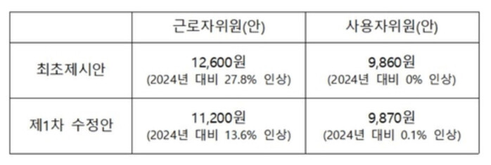 노동계는 올해보다 27.8% 대폭 오른 시간당 1만2천600원을 최초 요구안으로 제시했다가 1천400원을 낮췄고, 경영계는 '9천860원 동결' 요구에서 단 10원을 올려 수정안을 제시했다.