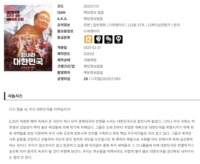 | ▲ 윤석열 다큐 '힘내라 대한민국' 시놉시스 (출처=KOBIS) |