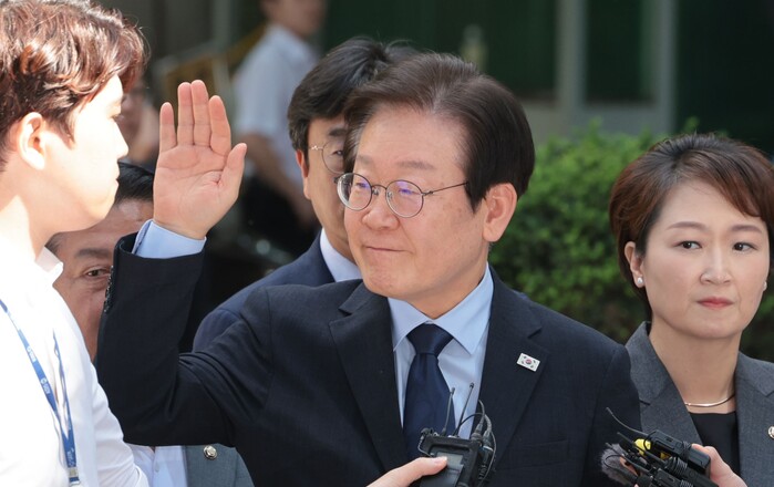 | ▲법원에서 지지자들 향해 손 흔드는 이재명 대표 (사진=연합뉴스) |