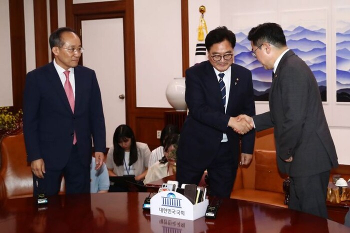 | ▲ 우 의장 주재로 만난 박찬대 원내대표와 추경호 원내대표(사진=연합뉴스) |
