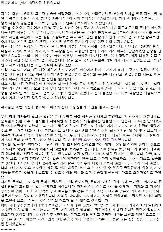 아울러 “사실을 사실대로 보도해야지, 사실을 알았더라도 정치적 시기와 파장을 고민해 보도를 미루는 것이 우리의 태도가 될 순 없다”라며 “사내 구성원들에게 1판에 들어갔던 기사에 대한 공동의 판단을 묻고자 기사와 함께 발행하려고 했던 녹음 파일도 첨부한다. 물론, 이런 과정을 밟더라도 편집위원회가 내린 집체적 판단이 달라지지는 않을 것”이라고 비관적 입장을 내비쳤다.