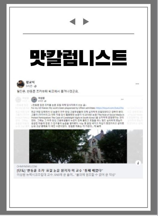 맛칼럼니스트 황교익씨는 오마이뉴스 기사를 자신의 페이스북에 올려, 한동훈 조카부터 학교에서 쫒겨나게 됐다고 짤막한 글을 올렸다.