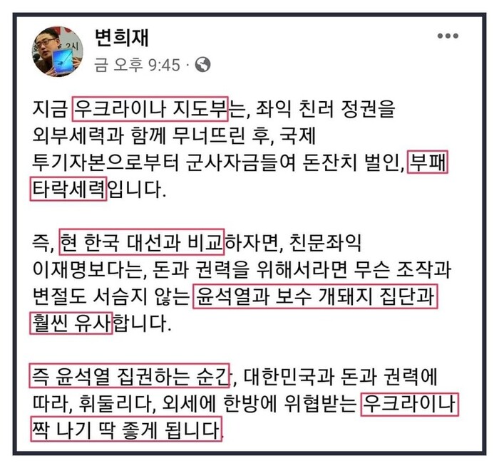 변희재씨는 "지금 우크라이나 지도부는 좌익 친러 정권을 외부세력과 함께 무너뜨린 후 국제 투기자본으로부터 군사자금을 들여 돈잔치 벌인 부패 타락세력"이라며 "즉, 현 한국 대선과 비교하자면 친문 좌익 이재명 보다는 돈과 권력을 위해서라면 무슨 조작과 변절도 서슴지 않는 윤석열과 보수 개돼지 집단과 훨씬 유사하다"라고 힐난했다.