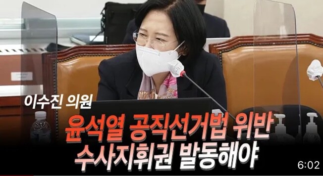 이수진 더불어민주당 의원이, 14일 국회 법제사법위원회 전체회의에서 박범계 법무부장관을 향해 윤석열 당선인의 공직선거법 위반 사건에 대한 수사지휘권을 발동해줄 것을 요청했다.