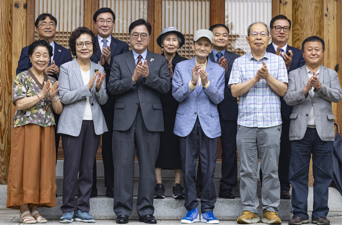 | ▲ 우원식 국회의장이 13일 국회 사랑재에서 광복 80주년을 맞이해 열린 반민특위 유족 초청 오찬에 앞서 기념 촬영을 하고 있다. 2025.8.13 (사진=연합뉴스) |