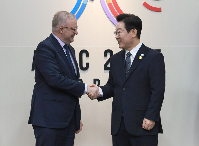 | ▲ 이재명 대통령과 앤서니 앨버니지 호주 총리가 30일 경북 경주 APEC 정상회의장에서 정상회담에 앞서 악수하고 있다. 2025.10.30 (사진=연합뉴스) |
