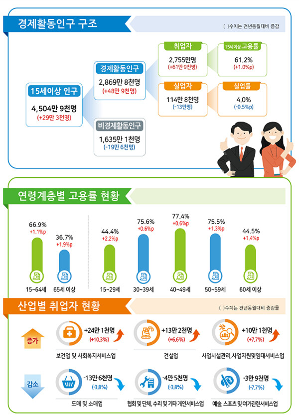 특히 청년층(15∼29세) 고용률(44.4%)이 같은 달 기준 2005년(45.5%) 이후 가장 높았다. 청년층 취업자는 13만 8000명 늘어 인구감소에도 불구하고 3개월 연속 전년 동월대비 10만 명 이상 증가했다. 30~40대 취업자는 감소하고 있으나 인구감소에 따른 취업자 자연감소를 감안한 고용상황은 2개월 연속 개선됐다.