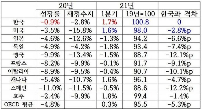 분기별 성장률은 코로나 19 발생과 함께 지난해 1분기(-1.3%)와 2분기(-3.2%) 두 분기 연속 마이너스(-)를 기록한 뒤 3분기(2.1%), 4분기(1.2%)에 이어 올해 1분기(1.7%)까지 세 분기 연속 반등했다. 이에 따라 국내 경제 규모는 지난 1분기에 코로나 19 발생 이전 수준을 완전히 회복했다.