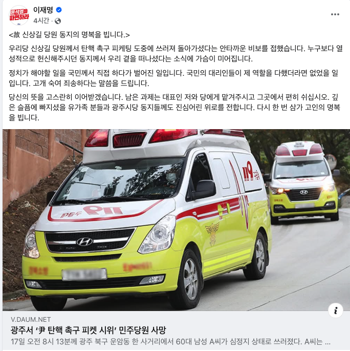 앞서 이날 오전 8시13분께 광주 북구 운암동 한 사거리에서 민주당 당원인 신씨가 윤석열 탄핵을 촉구하는 피켓 시위 중 심정지 상태로 쓰러졌다. 신씨는 신고를 받고 출동한 소방 당국에 의해 병원으로 옮겨졌으나 숨졌다.