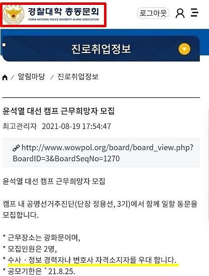 | ▲경찰대학 총동문회 윤석열 캠프 근무자 모집 공고. 뉴스핌 홈페이지 캡처. |