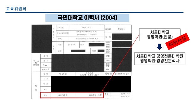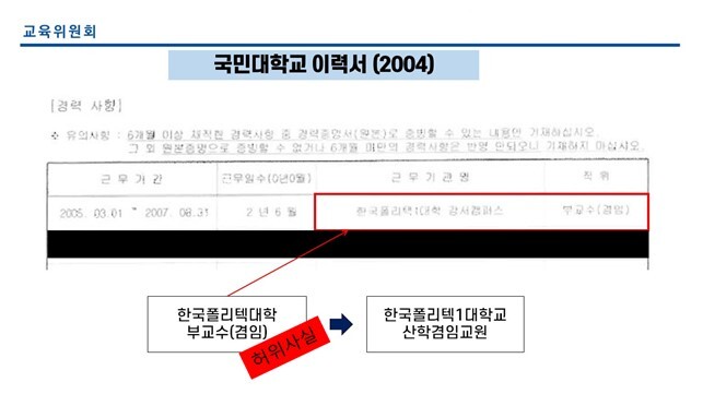 2014학년도 국민대 겸임교수 임용 당시 제출한 이력서 경력사항에 한국폴리텍1대학 강서캠퍼스 시간강사/산학겸임교원을 ‘부교수(겸임)’로 허위기재하고 학력사항에 ‘서울대 경영전문대학원 경영전문석사’를 ‘서울대 경영학과 석사’로 기재한 것으로 밝혀졌다.