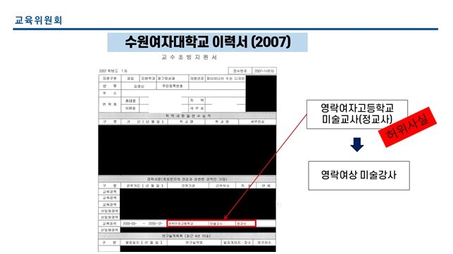 더불어민주당 권인숙 의원실에서 교육부로부터 제출받을 자료에 따르면 김 씨는 2007 학년도 수원여대 겸임교원 임용 당시 제출한 이력서 경력사항에 영락여상 미술강사를 영락여고 미술교사(정교사)로 기재했다.