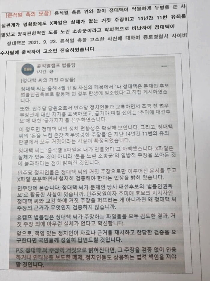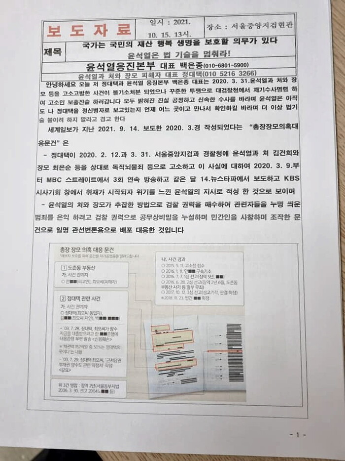 윤석열 장모와 오랜 소송의 피해자 정대택씨가 10월15일 서울중앙지검에 윤석열 장모 모해위증 재기수사로 진술과 증거를 제출하였다.