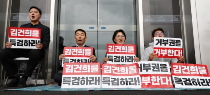 윤 원내대변인은 "김 여사가 진짜 대통령이고, 국정과 당무에 마구잡이로 개입하고 있다는 의심을 지울 수 없다"며 "대통령실이 생각하는 여당의 존재 이유가 대통령 부부를 지키는 데 있는가"라고 반문했다.