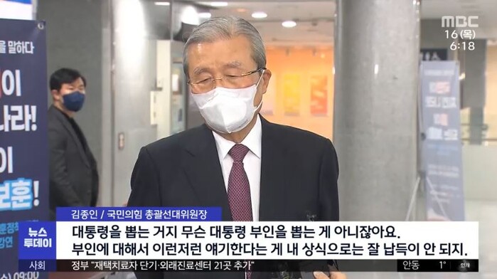 김종인 국민의힘 총괄선대위원장이 어제(15일) ‘대통령 부인을 뽑는 선거가 아니다’라며 윤석열 후보의 배우자 김건희 씨를 두둔했습니다.