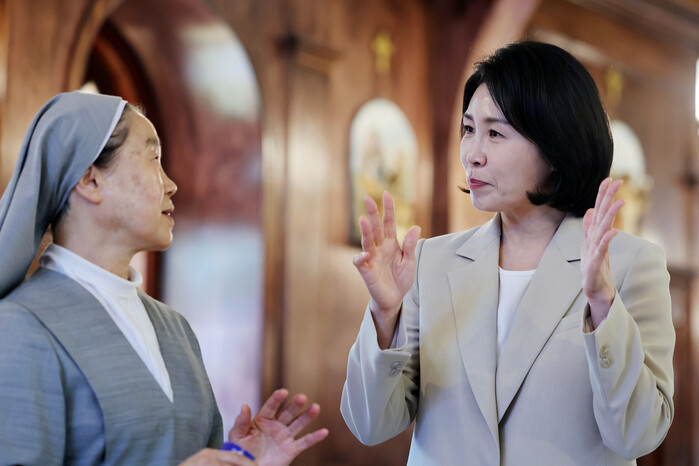 | ▲ 전남 고흥군 소록도 내 성당에서 더불어민주당 이재명 대선 후보의 배우자 김혜경 여사가 한 수녀와 이야기를 나누고 있다. 2025.5.27 (사진=연합뉴스) |