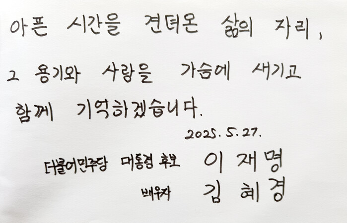 | ▲ 더불어민주당 이재명 대선 후보의 배우자 김혜경 여사는 27일 전남 고흥군 소록도를 방문해 주민들과 간담회를 했다. 사진은 간담회 후 김 여사가 작성한 방명록. 2025.5.27 (사진=연합뉴스) |