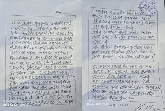 | ▲송 전 대표의 자필 입장문(사진=연합뉴스) |